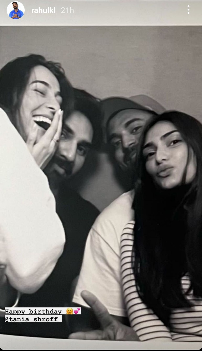 इस बीच हाल ही में केएल राहुल ने अपने इंस्टाग्राम स्टोरी पर एक तस्वीर साझा की है, जिसमें अथिया शेट्टी के साथ अहान शेट्टी और उनकी गर्लफ्रेंड तानिया श्रॉफ नजर आ रही हैं, यह एक ब्लैक एंड वाइट तस्वीर है। दरअसल अहान और तानिया एक दूसरे को काफी लंबे समय से डेट कर रहे हैं और दोनो केएल राहुल के काफी अच्छे दोस्त हैं। जिस वजह से राहुल ने भी तस्वीर साझा करते हुए तानिया को बर्थ डे विश किया।