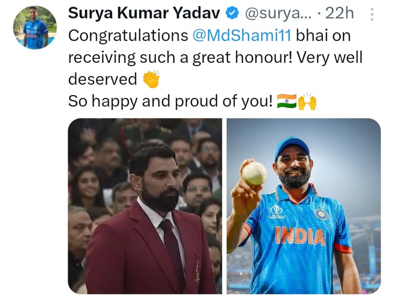 दूसरी ओर हाल ही में टीम इंडिया के तेज गेंदबाज मोहम्मद शमी को Arjuna Award से सम्मानित किया है, जिसे लेकर गेंदबाज को साथी खिलाड़ियों ने बधाई दी थी। इसी कड़ी में सूर्यकुमार यादव ने शमी की 2 तस्वीरों को ट्वीट किया था, वहीं कैप्शन में SKY ने लिखा था- आप इस अवॉर्ड के हकदार थे और हमें आप पर गर्व है शमी। गौरतलब है कि शमी ने वनडे वर्ल्ड कप 2023 में शानदार गेंदबाजी करते हुए 24 विकेट अपने नाम किए थे और इसी को देखते हुए उन्हें ये अवॉर्ड मिला है।