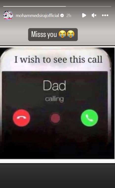 इस पोस्ट में मोबाइल पर पिता का कॉल आते हुए नजर आ रहा है, जिस पर लिखा हुआ है- ‘मैं यह कॉल देखना चाहता हूं’। मोहम्मद सिराज (Mohammad Siraj) ने इसे शेयर करते हुए मिस यू लिखा और साथ ही दो रोते हुए इमोटिकॉन्स भी लगाए हैं। इस पोस्ट को देख साफ पता चल रहा है कि भारतीय गेंदबाज अपने पिता को मिस कर रहे हैं, क्योंकि इस खुशी के मौके पर सभी अपने परिवार के करीब हैं, कॉल पर उन्हें बधाई दे रहे हैं।