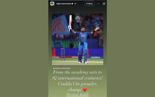 बता दें कि चैंपियंस ट्राॅफी में इंटरनेशनल क्रिकेट में 82 शतक पूरा करने पर राजकुमार शर्मा ने विराट कोहली को इंस्टा पर टैग करते हुए एक स्टोरी अपडेट की है। इस स्टोरी में उन्होंने लिखा- एकेडमी के नेट्स से लेकर 82 इंटरनेशनल शतक तक, इससे अधिक गर्व की बात नहीं हो सकती, चैंप विराट कोहली
