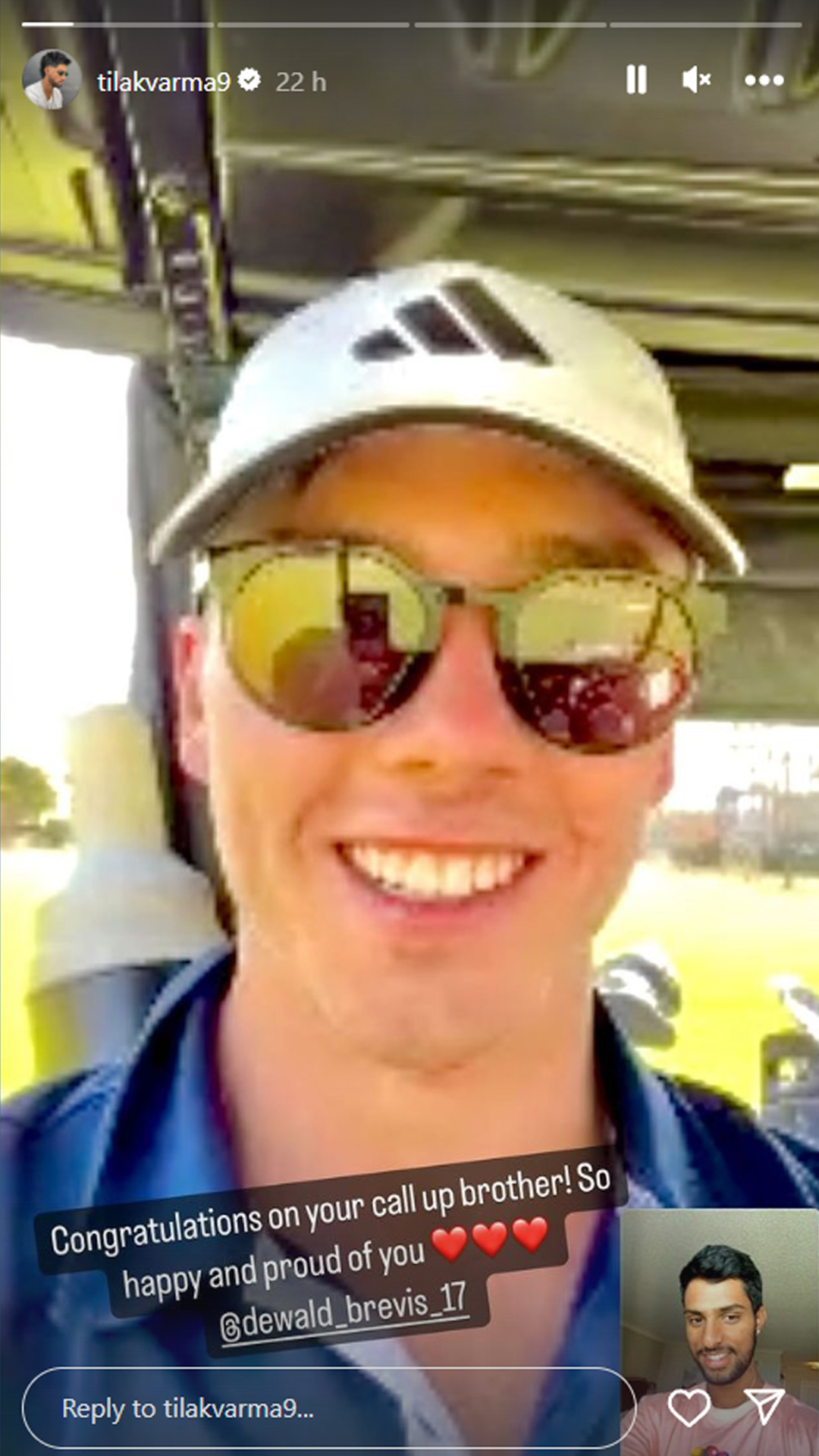 इस खास मौके पर टीम इंडिया के युवा खिलाड़ी तिलक वर्मा ने इंस्टाग्राम पर डेवाल्ड ब्रेविस को बधाई दी। ऐसा माना जा रहा है कि ब्रेविस और तिलक वर्मा काफी अच्छे दोस्त हैं। ब्रेविस ने भी हाल ही में तिलक को उनके भारत के लिए डेब्यू करने पर बधाई दी थी। 20 वर्षीय खिलाड़ी ने बाद में उन्हें धन्यवाद देते हुए जवाब दिया और मुंबई इंडियंस कैंप में उनके साथ अपने रिश्ते के बारे में बताया था।