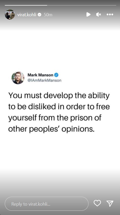 जिससे निराश होकर विराट ने इंस्टाग्राम स्टोरी पर अपने इमोशन शेयर किए हैं। विराट कोहली ने अपनी इंस्टा स्टोरी पर एक अमेरिकी लेखक और ब्लॉगर मार्क मैनसन का एक प्रेरणादायक मैसेज शेयर किया, जहां लिखा हैं: “आपको दूसरों की राय की कैद से खुद को आजाद करने के लिए आपको लोगों द्वारा पसंद नहीं किए जाने की क्षमता विकसित करना ही चाहिए।”